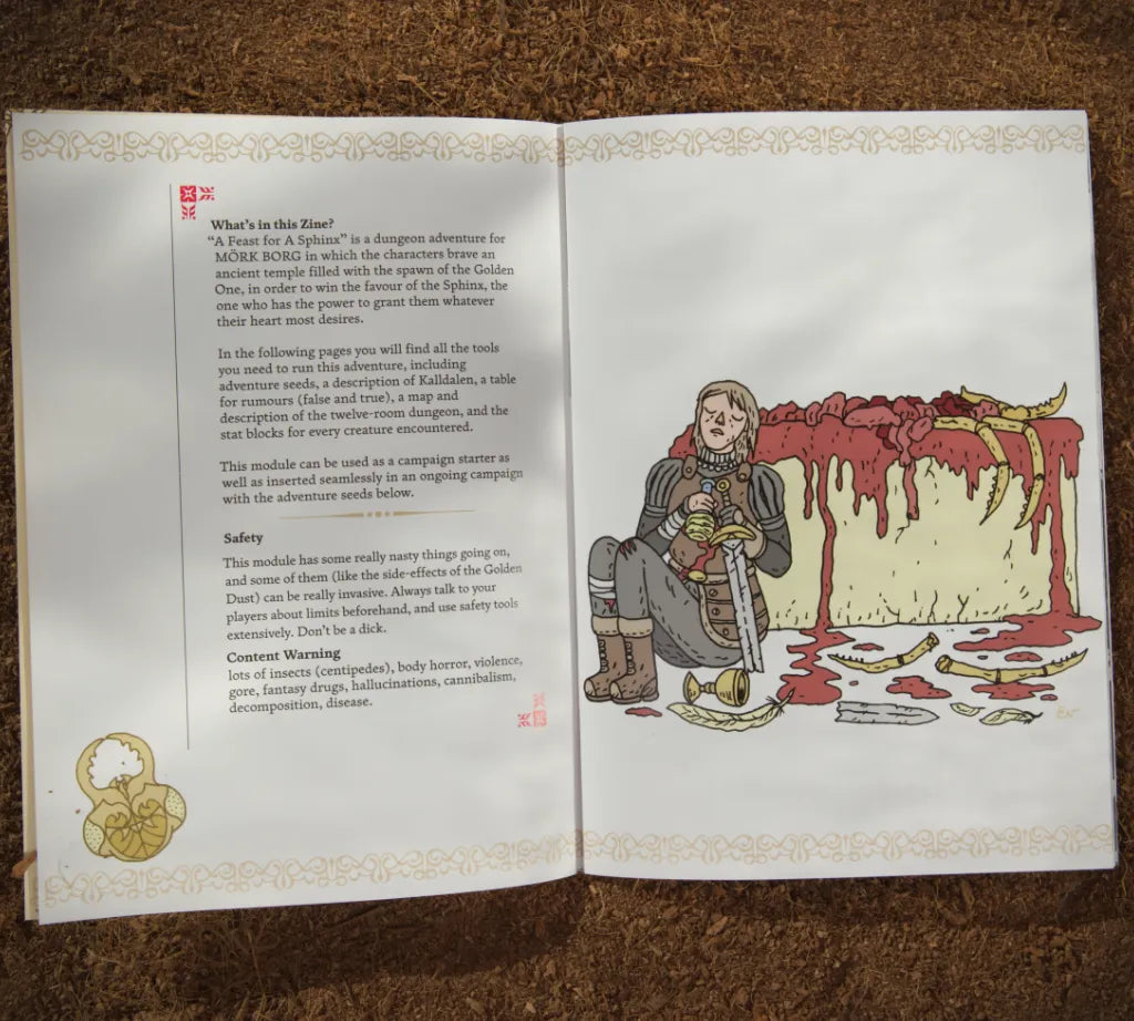 "A Feast for a Sphinx" is a dungeon adventure for MÖRK BORG, set in the secluded village of Kalldalen and the ancient temple that lies beneath. Once hidden from the dying world, the call of the mysterious Sphinx has drawn in greedy plunderers and scum of all kinds, desperate for the ultimate reward: to fulfil a wish. Any wish.