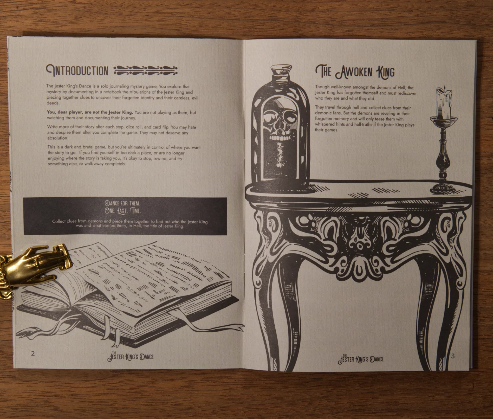The Jester King's Dance is a solo journaling mystery game. That is explored by yourself by documenting in a notebook the tribulations of the Jester King and piecing together clues to uncover who they once were and their careless, evil deeds.