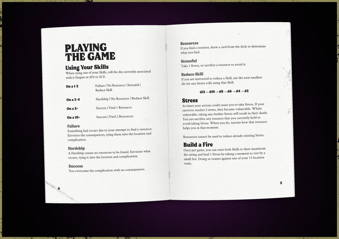 Each of these skills is represented by a dice value which can decrease in size for every failure to overcome a challenge. The more you try to survive, the harder things eventually become.
